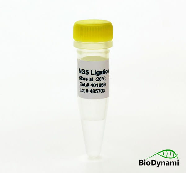 The proprietary components in the buffer improve ligation of NGS adaptors to dA-tailed DNA fragments dramatically. The ligation is performed at room temperature (20°C) for only 20 minutes with high efficiency. The enzyme is also optimized for use with the BioDynami End Repair/dA-Tailing Master Mix (Cat.# 40104S; 40104L).