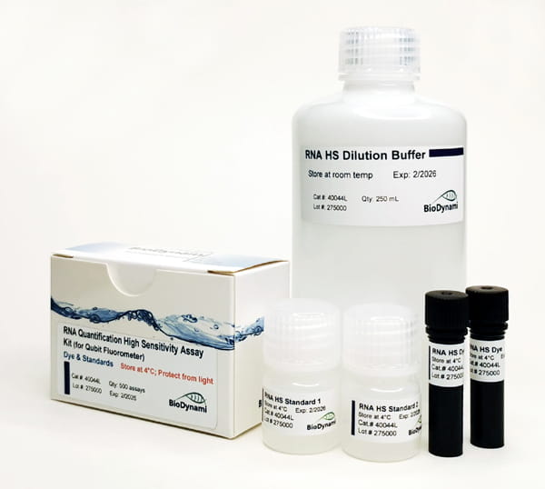 The RNA Quantification HS kit includes HS Dye, HS Dilution Buffer, and two RNA Standards. Simply dilute the HS Dye with the HS Dilution Buffer, add RNA sample, then read the concentration using the Qubit Fluorometer.